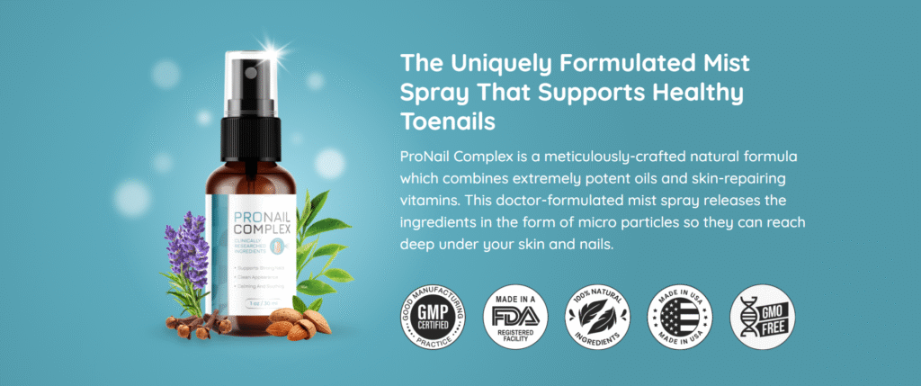 ProNail Complex is a topical spray designed for daily nail and foot skin care. It combines natural oils and well-known active ingredients traditionally used to support skin health, particularly in cases where nails appear weakened, discolored, or uneven.